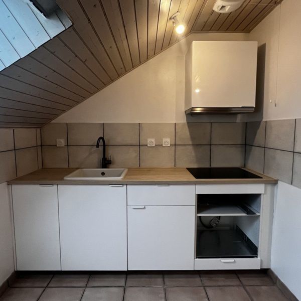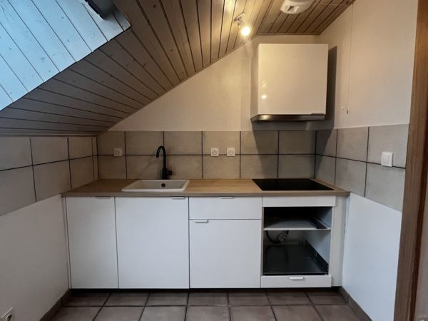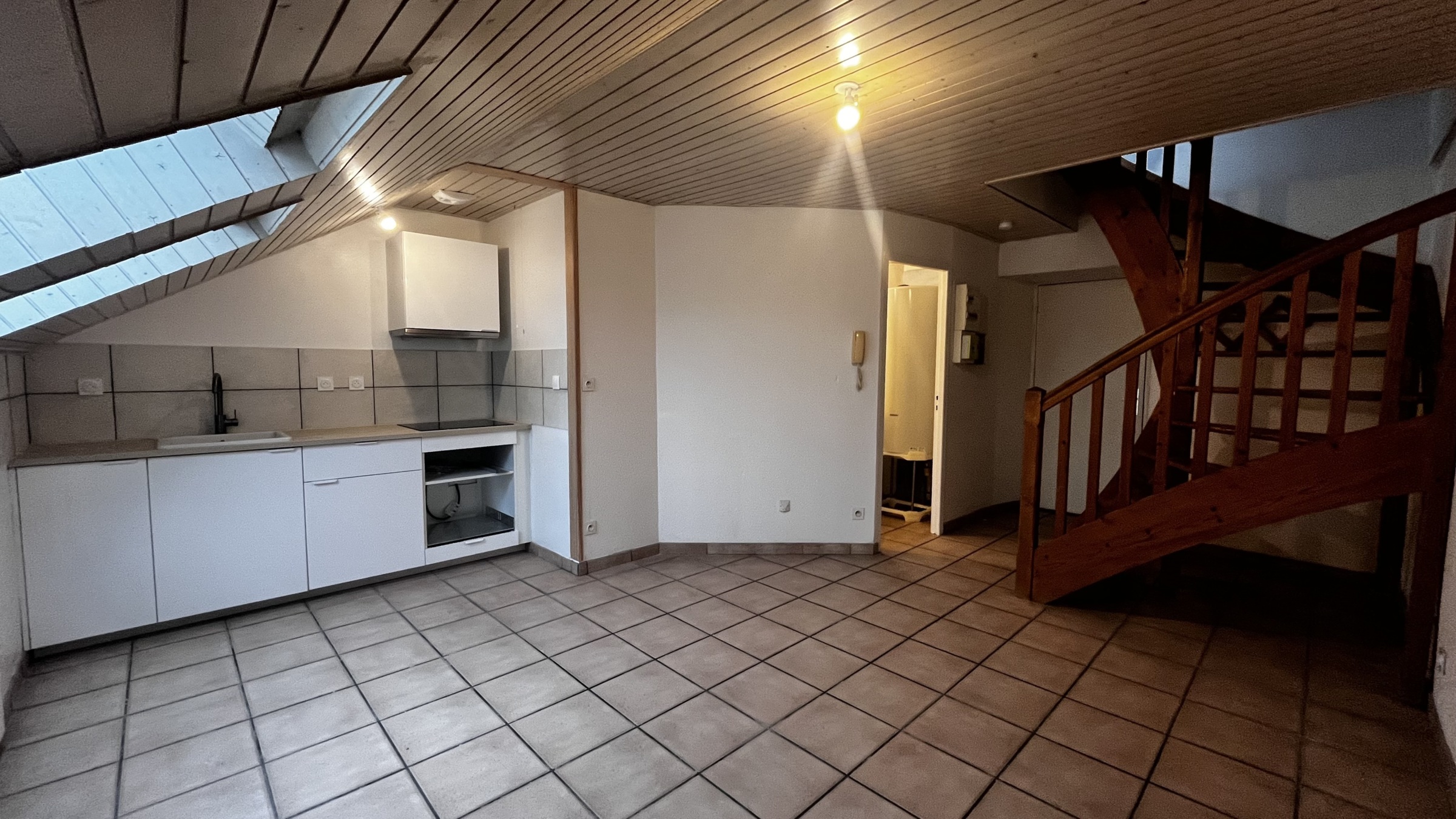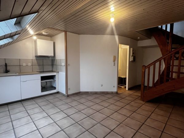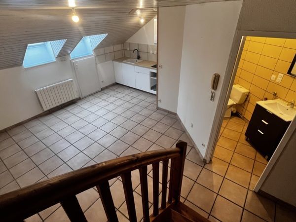 Entrée sur salon/séjour avec coin cuisine meublée et en partie équipée (plaque cuisson - hotte) - salle d'eau avec WC - Chambre en mezzanine