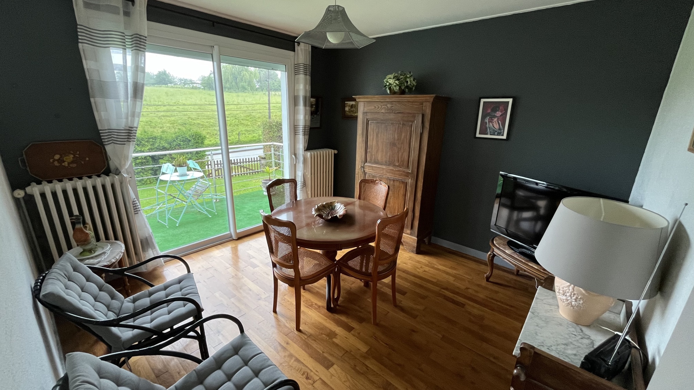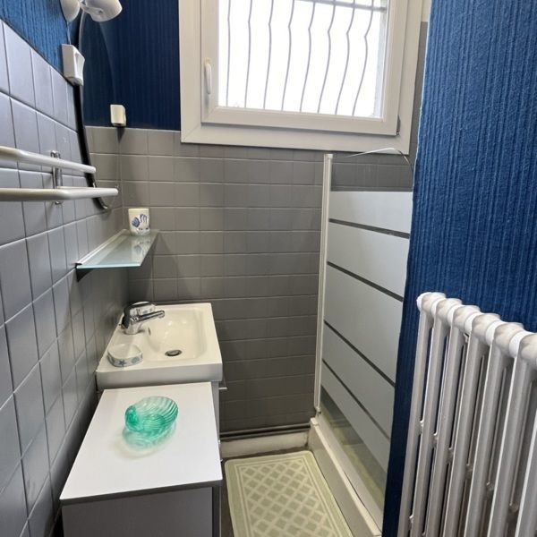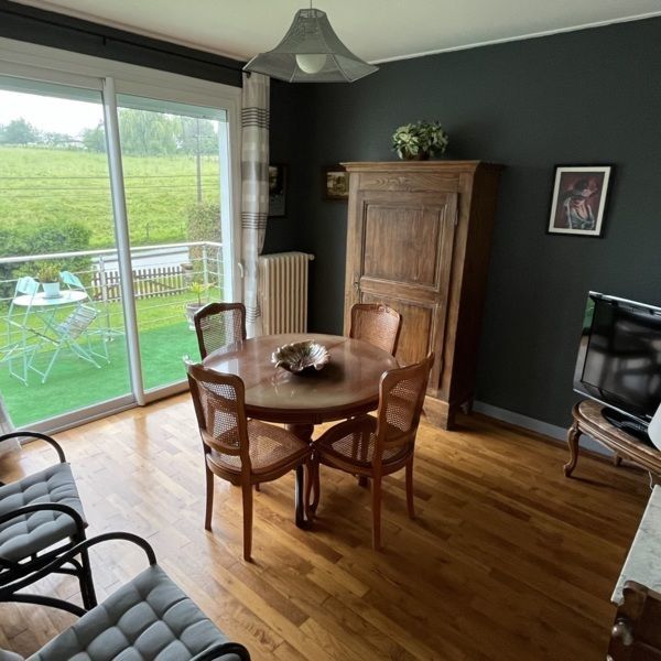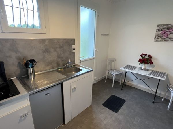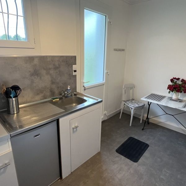 Entrée sur cuisine équipée et meublée - salon/séjour - 1 chambre - salle d'eau - WC