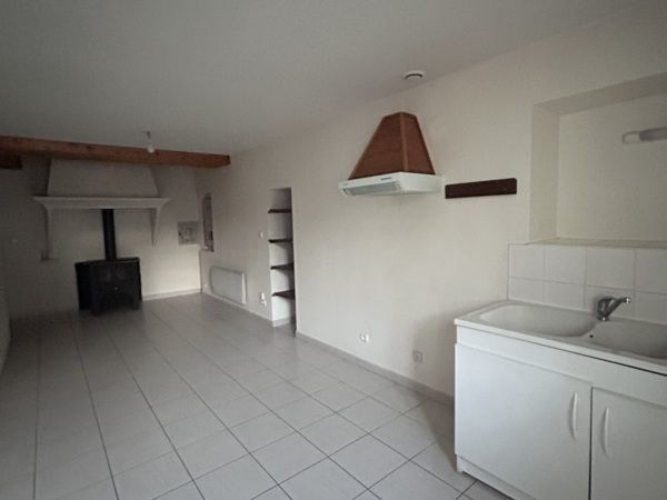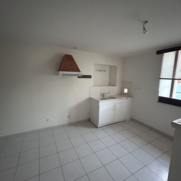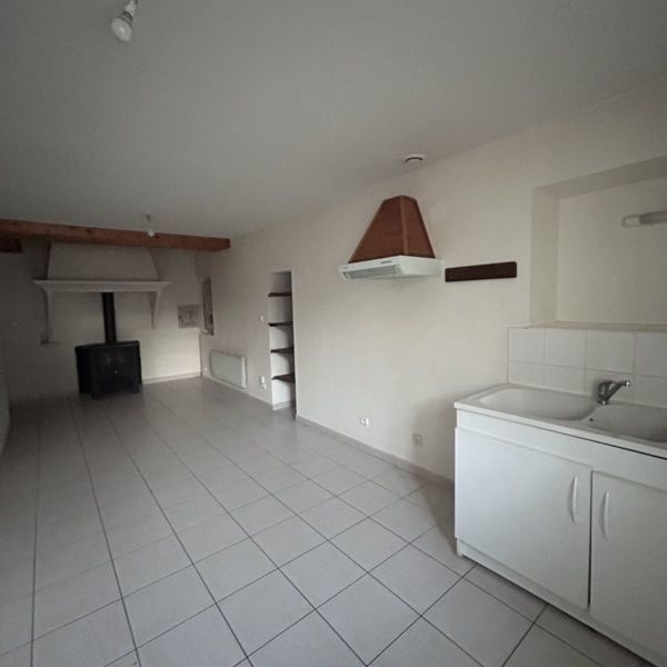 Sur l'avant : Entrée sur cuisine / salle à manger avec accès garage et bûcher - salle d'eau - WC