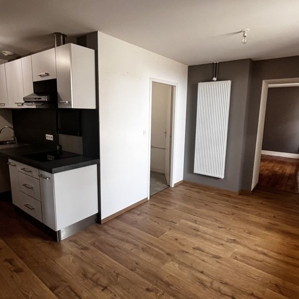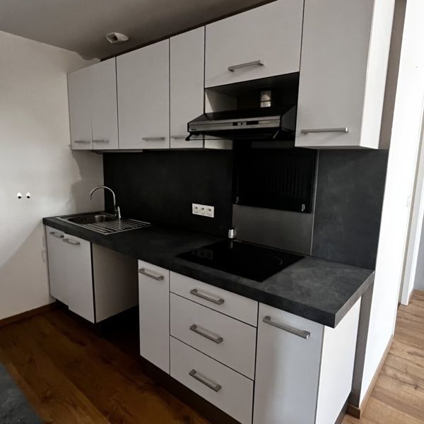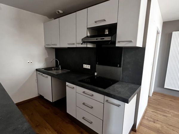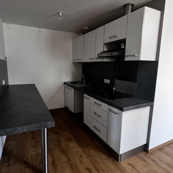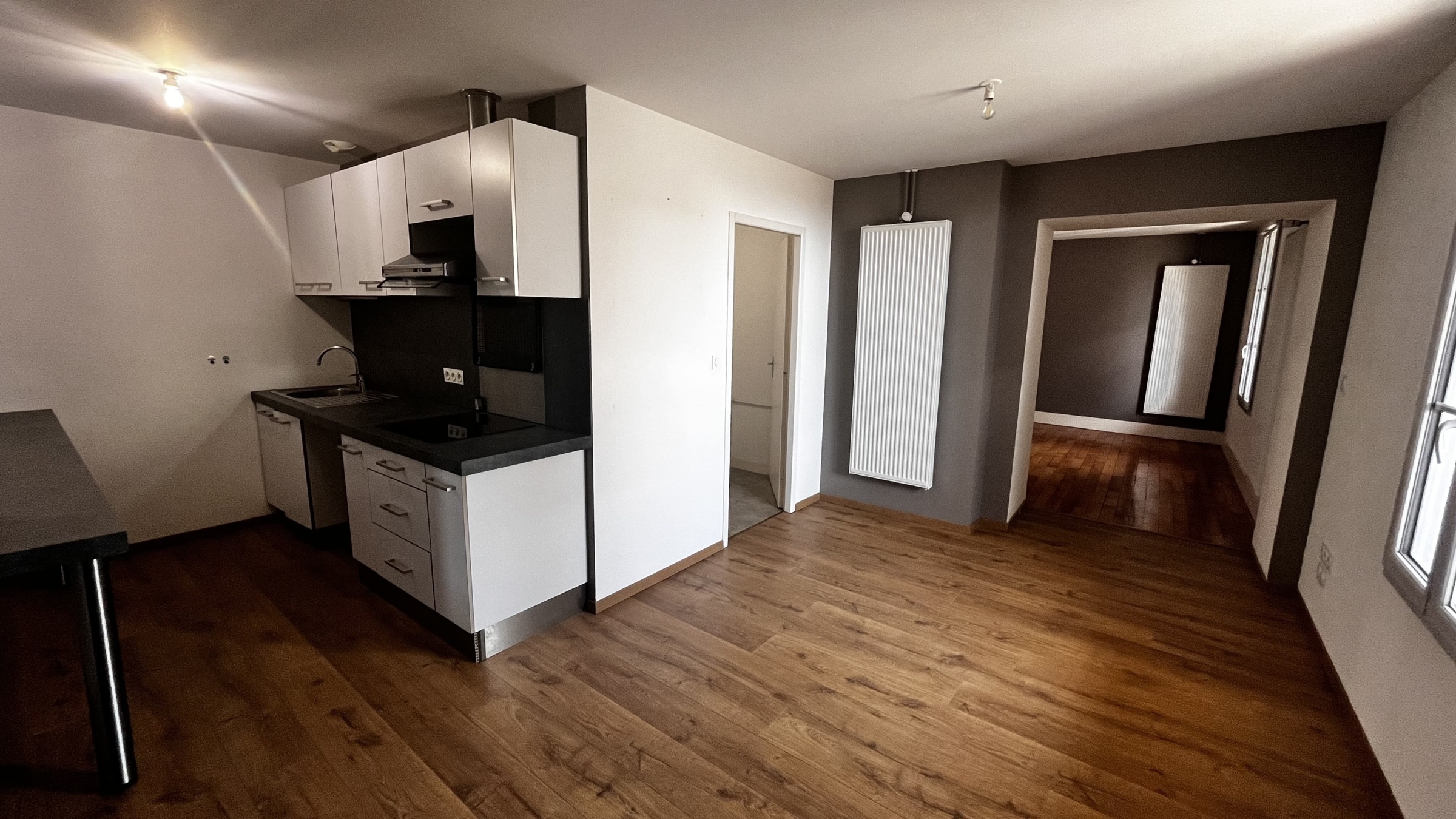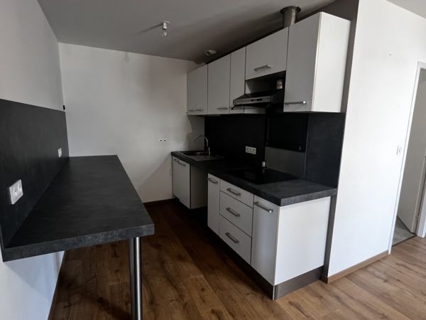 Entrée sur vaste cuisine semi-équipée et meublée (plaque induction + hotte) - salle d'eau avec WC - pièce principale