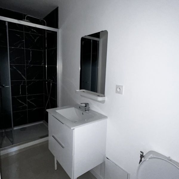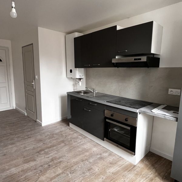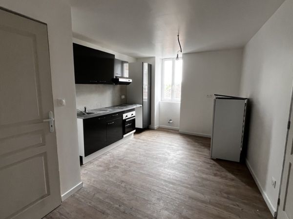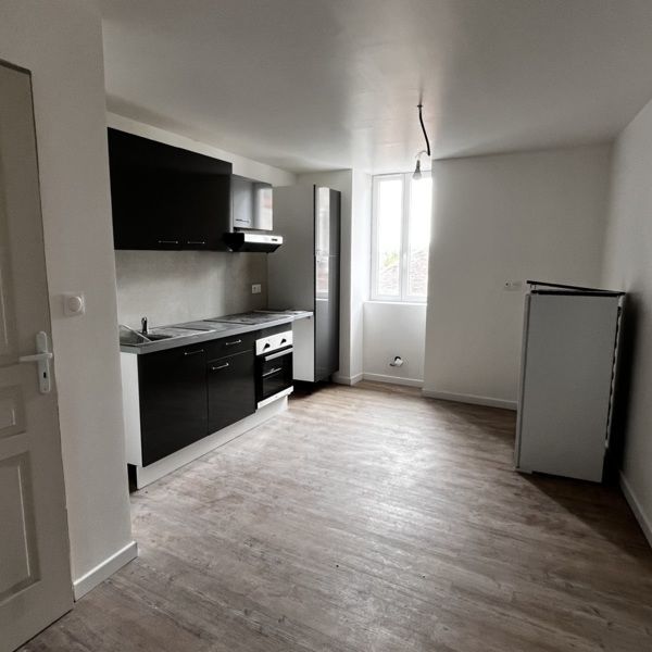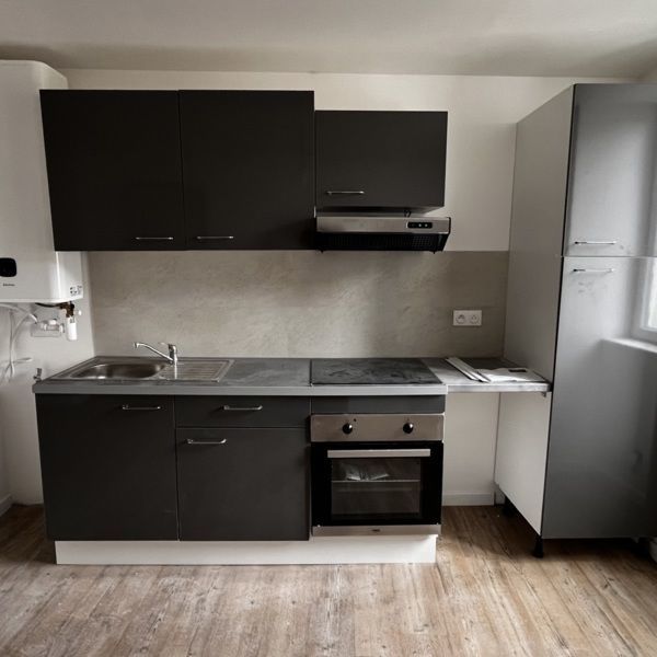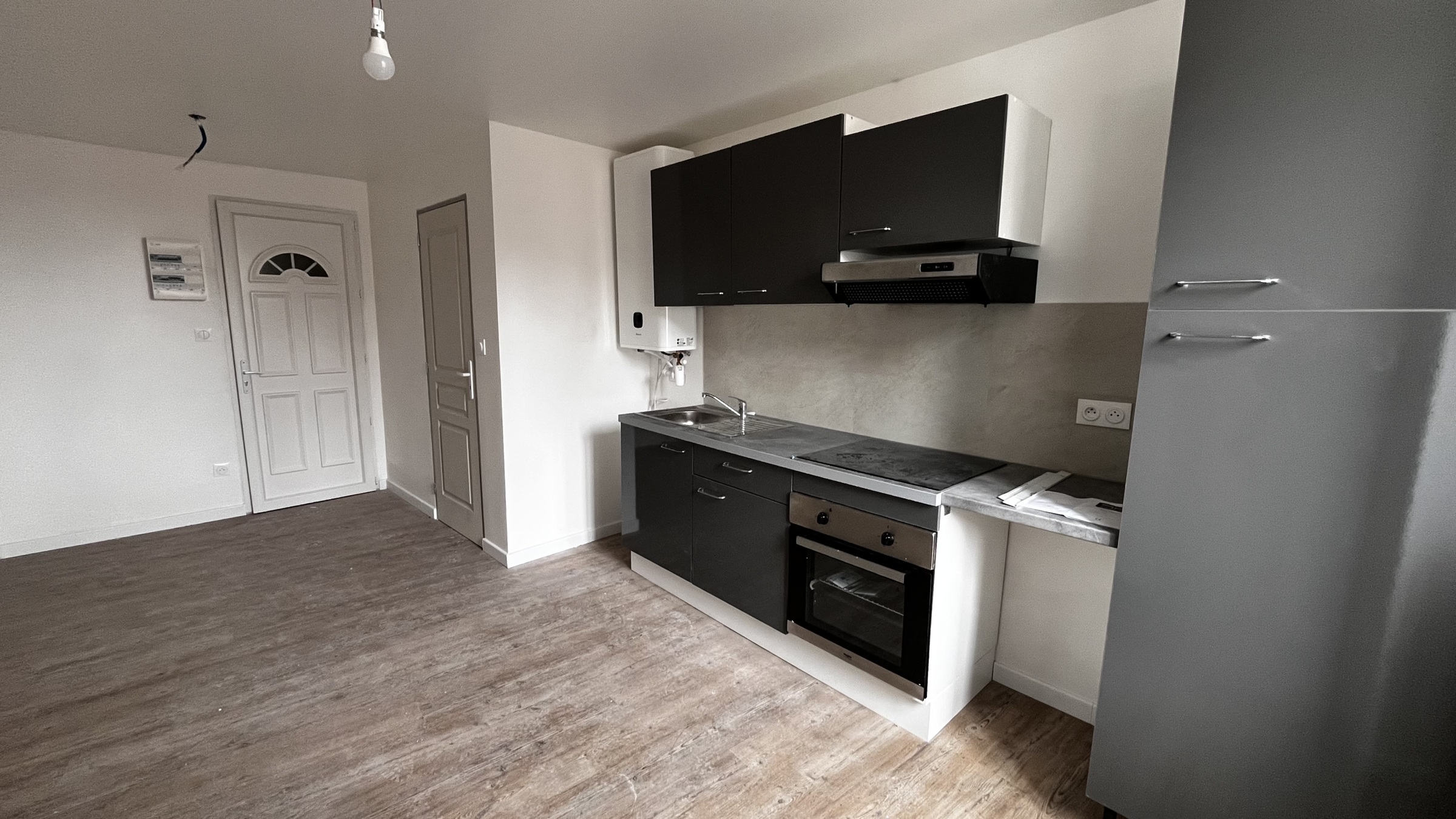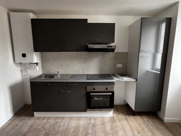 Entrée sur séjour avec coin cuisine meublée et équipée (hotte + plaque cuisson + four + frigo) - salle d'eau avec WC - chambre de 7m2