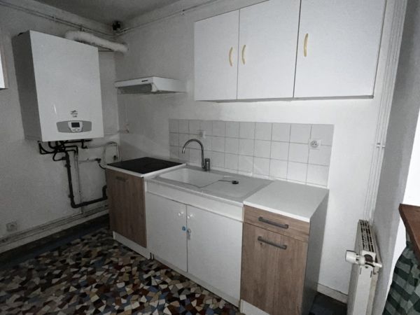 Entrée - cuisine ouverte meublée et en partie équipée (plaque cuisson + hotte) sur séjour/salon donnant sur terrasse - vaste dégagement - 3 chambres dont 2 avec placards - salle de bains - WC
