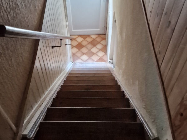 A gauche de la cuisine nous avons une pièce avec un placard et au fond à gauche la 2ème porte d’entrée, en face un escalier pour accéder à l’étage ; à l’étage une chambre avec un point d’eau, wc et l’accès au second grenier.