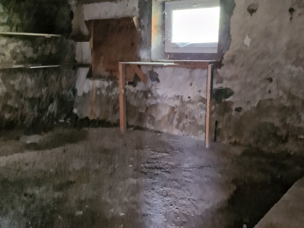 A ce jour, quand on rentre par la 1ère porte on arrive directement sur une cuisine, à droite se trouve un wc et au fond de cette pièce une salle de bain. A droite de la cuisine une pièce avec un balcon donnant sur le jardin. Au-dessus se trouve une chambre et un espace grenier.